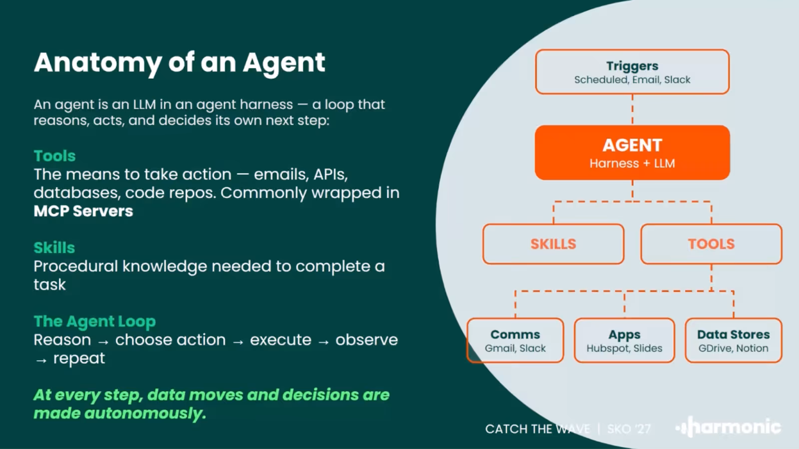 This is where I'd start because honestly the word has become kind of meaningless. Everyone's using it. Every vendor announcement has it. But what Jamie said that actually helped me was this: an agent is an LLM with a goal.