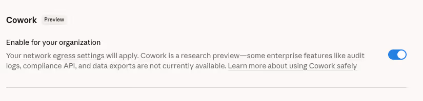 9. The admin toggle is all-or-nothing. Cowork access cannot be limited by user or role during the research preview. It’s organization-wide: everyone has access or no one does.