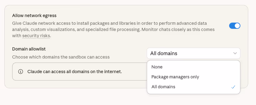 ☐ Network egress: keep defaults. The sandbox blocks most outbound traffic already. Only allowlist domains you’ve tested