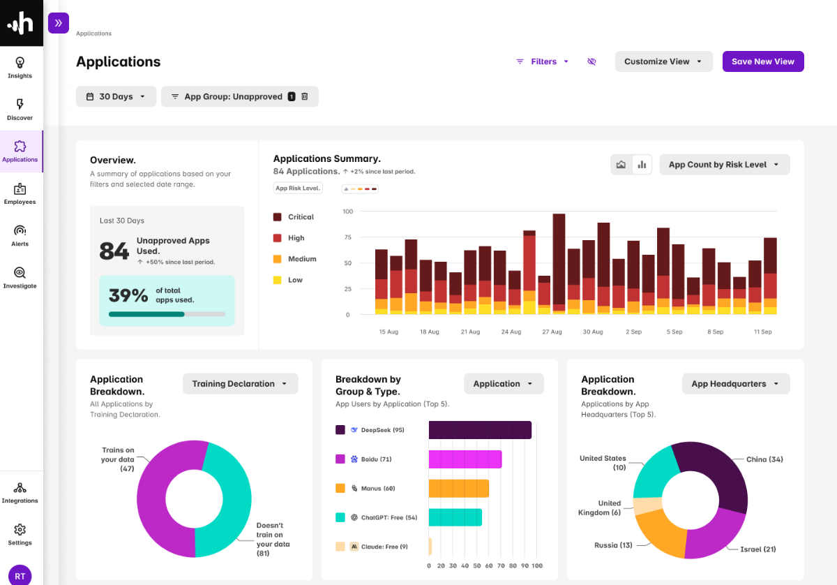 With Harmonic, you can report on all GenAI usage. This includes enterprise, free, and personal accounts of GenAI tools. It also extends to GenAI-enabled SaaS tools like Canva, Grammarly, and Gamma. Furthermore, you can create groups of applications to identify high risk use, such as tools located in China, or unapproved tools.