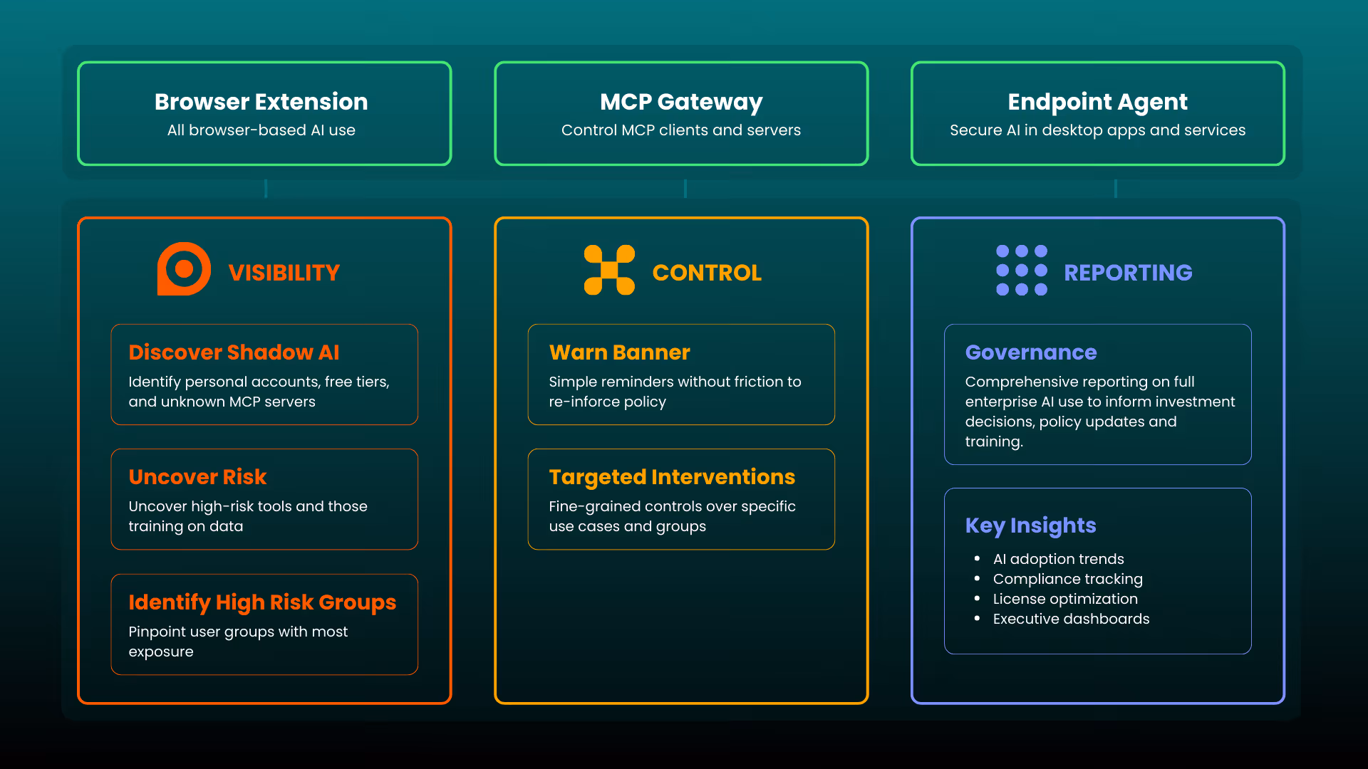 Our platform provides visibility and control across browser AI, agentic workflows, and desktop activity—showing actual usage and data flows.