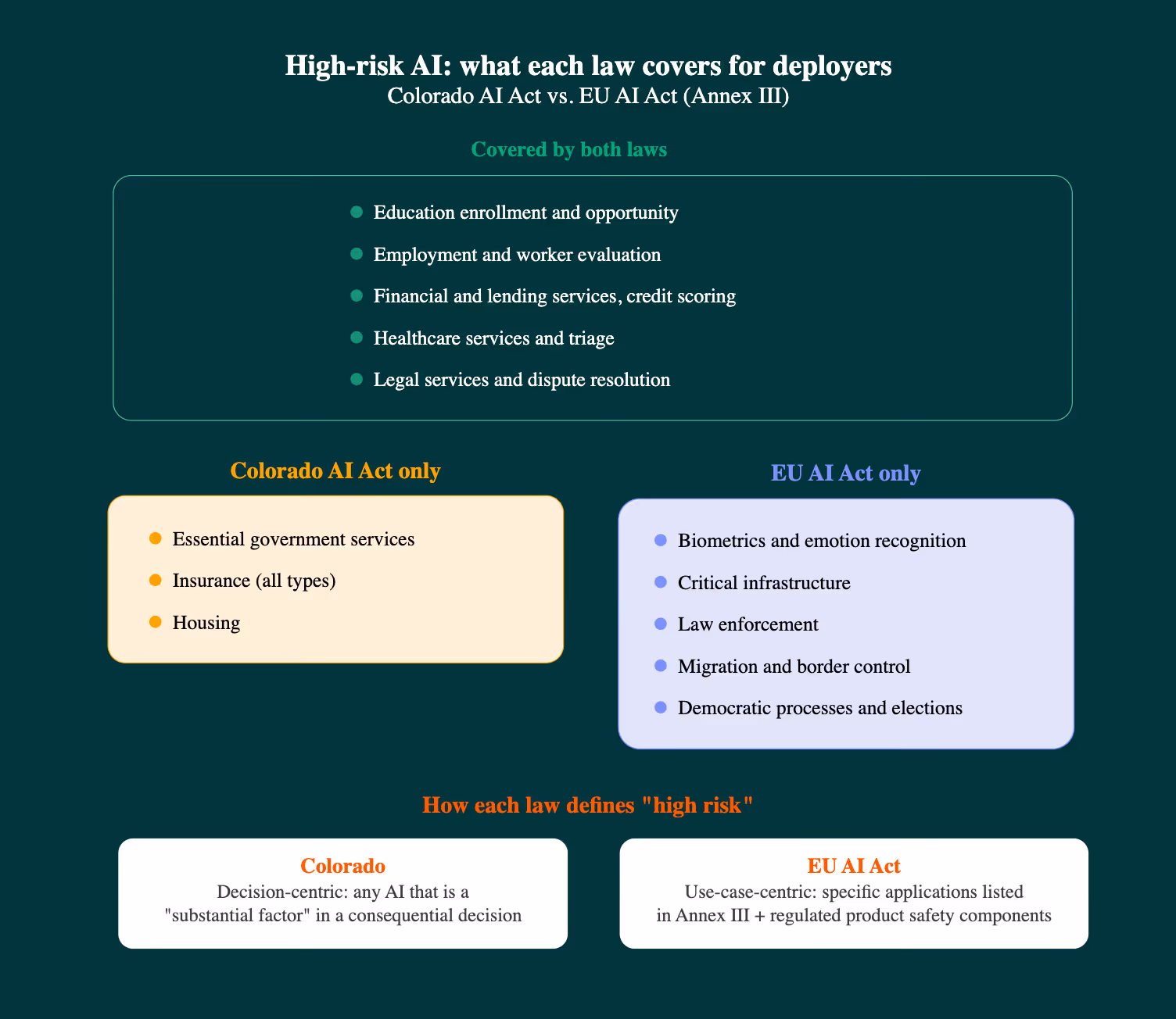 The divergence is also meaningful. The EU covers biometrics, critical infrastructure, law enforcement, migration, and elections. Colorado doesn't touch any of those. Colorado, for its part, explicitly covers government services, housing, and insurance beyond just life and health, areas where the EU framework doesn't directly map.