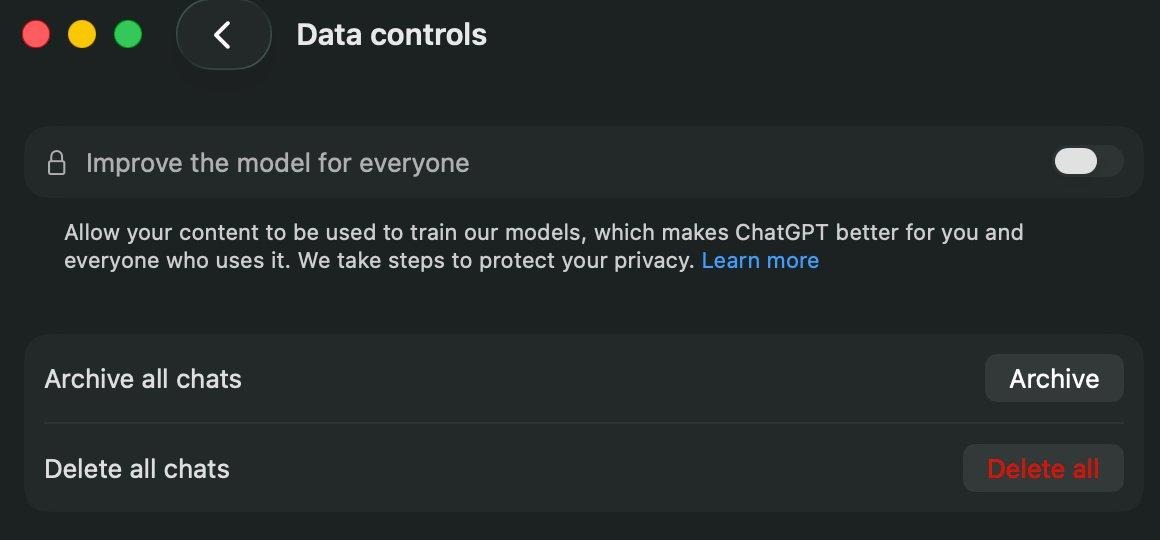 The ChatGPT desktop app’s Data Controls panel on an Enterprise plan. “Improve the model for everyone” is toggled off by default. Your conversations are not used for training.