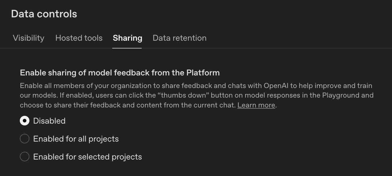On the API platform side, OpenAI provides granular controls under Data Controls with four separate tabs: Visibility, Hosted Tools, Sharing, and Data Retention. Every sharing option—model feedback sharing, evaluation and fine-tuning data sharing, and input/output sharing—defaults to Disabled.
