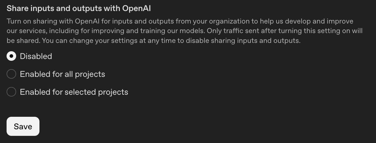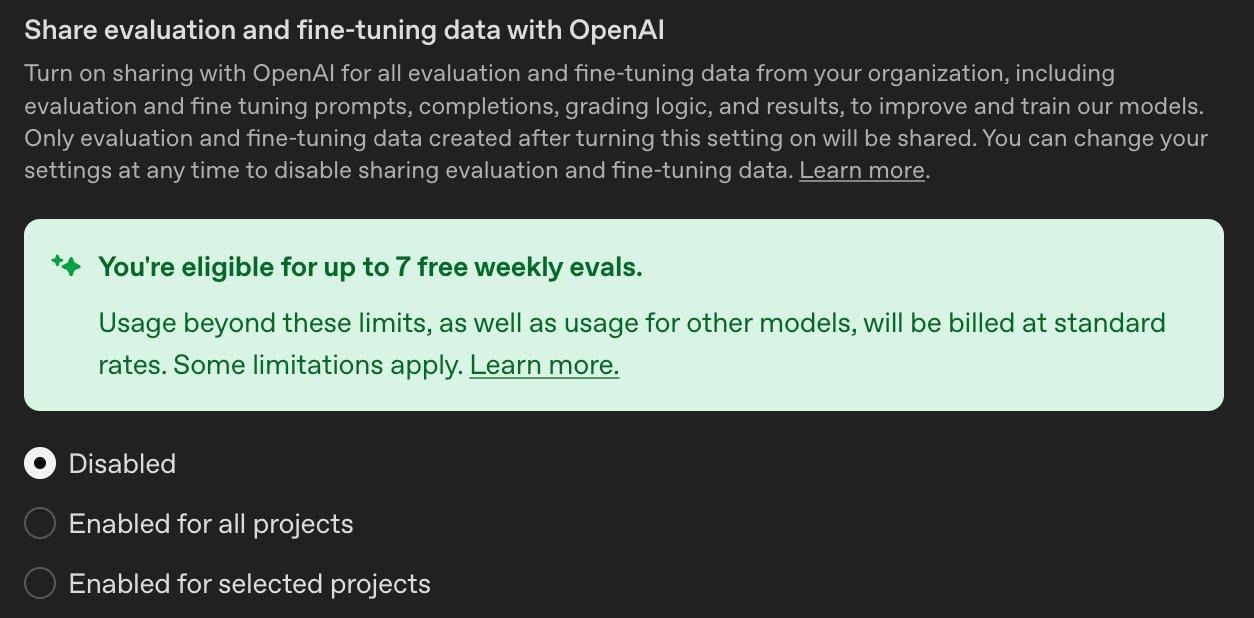 “Share evaluation and fine-tuning data with OpenAI” is also Disabled by default. Note the incentive: OpenAI offers free weekly evals if you opt in. Resist the temptation for regulated workloads.