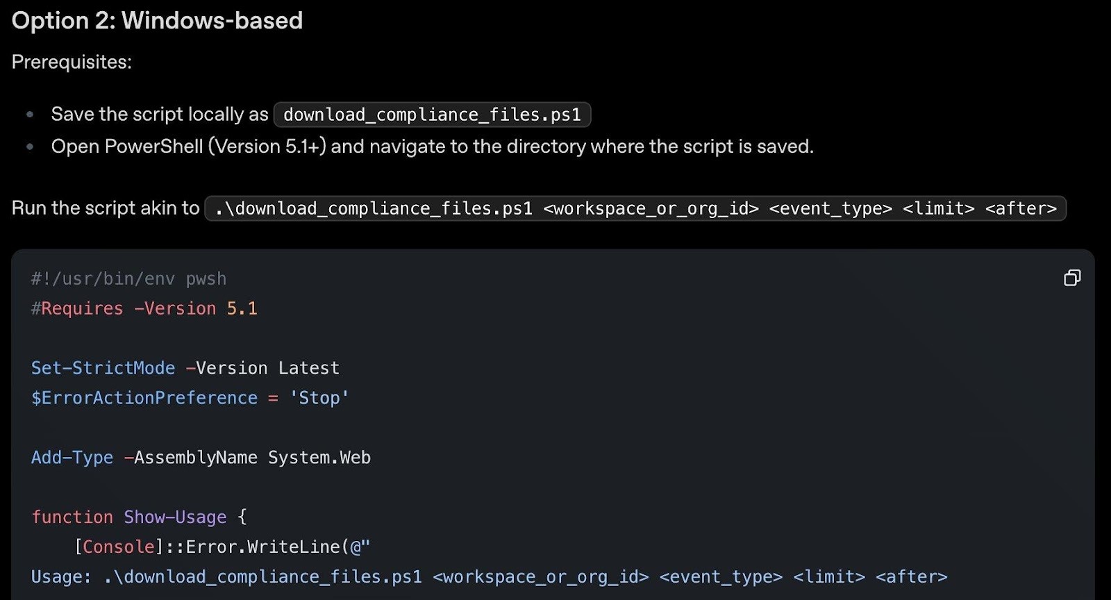 The equivalent download_compliance_files.ps1 PowerShell script for Windows. Same functionality for teams running Windows infrastructure. Requires PowerShell 5.1+.
