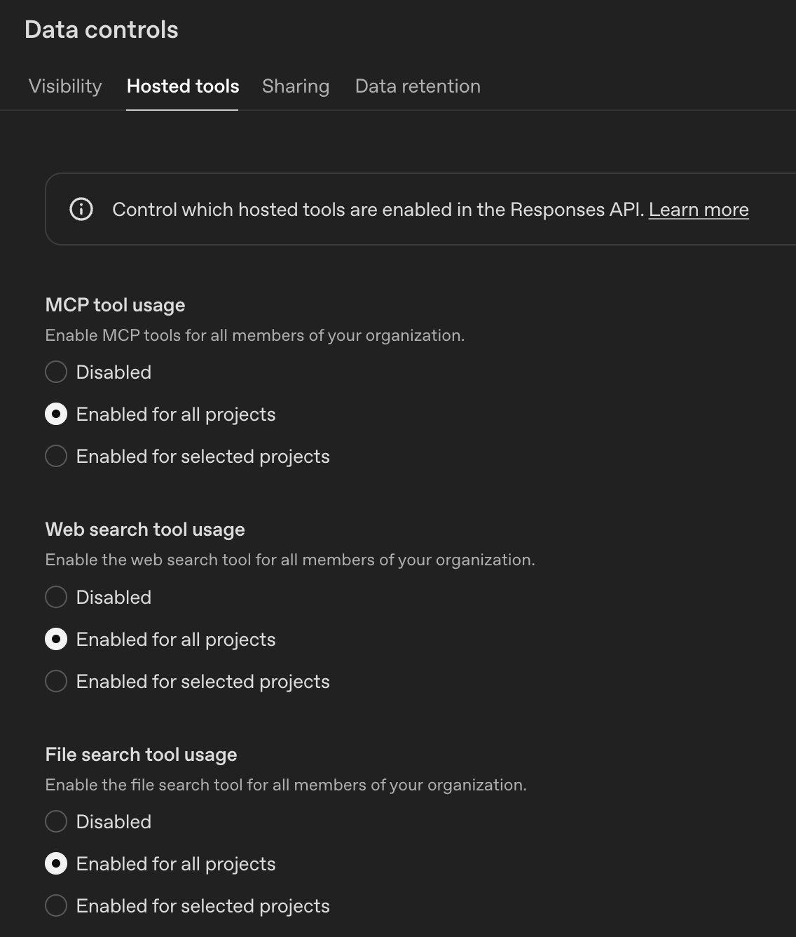 Hosted tools (MCP, web search, file search) are enabled for all projects by default on the API platform. Review whether your API-based applications actually need all of these capabilities.