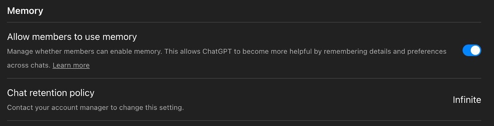 In the admin workspace settings, “Allow members to use memory” is toggled on and the Chat retention policy is set to Infinite. If you want memory fully disabled, turn this off at the workspace level too. Also note the retention policy: contact your account manager to change it from the default.