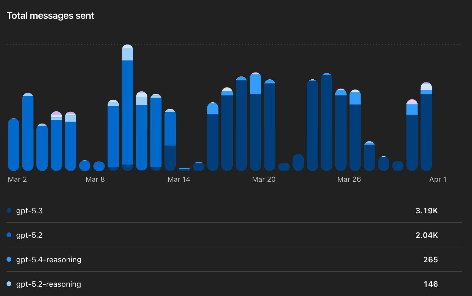 Total messages sent by model (GPT-5.3, GPT-5.2, GPT-5.4-reasoning, etc.). This tells you adoption volume and which models your team gravitates toward.