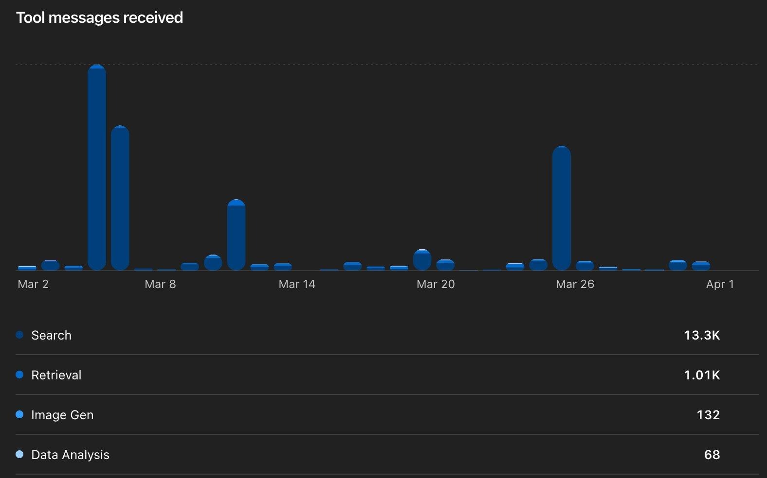 Tool messages received breaks down which capabilities are actually used: Search (13.3K), Retrieval (1.01K), Image Gen (132), Data Analysis (68).