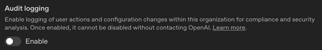 Audit logging for user actions and configuration changes is disabled by default on the API Platform. Once enabled, it cannot be disabled without contacting OpenAI. Enable it early to capture the full history.