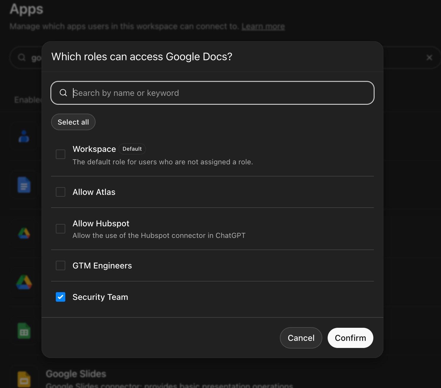 The RBAC role picker for Google Docs. Custom roles like “Security Team” and “GTM Engineers” control per-app access. The default “Workspace” role is unchecked—regular members don’t have access.