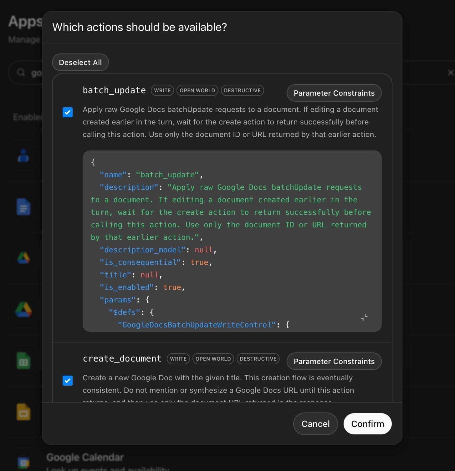 Click Manage Actions for each app. Actions are tagged with risk labels: WRITE, OPEN WORLD, and DESTRUCTIVE. New write actions are disabled by default, but verify this.