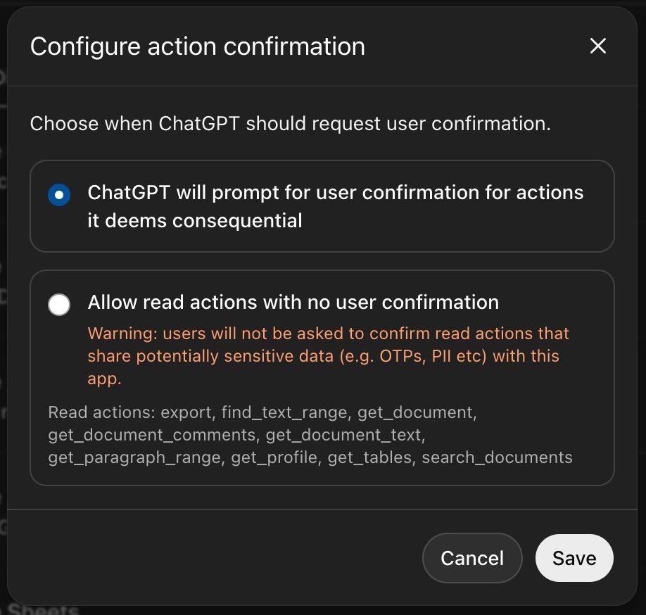 Review action confirmation settings. The default prompts users before consequential actions. Be cautious before enabling silent read actions as OpenAI warns this can share OTPs and PII.