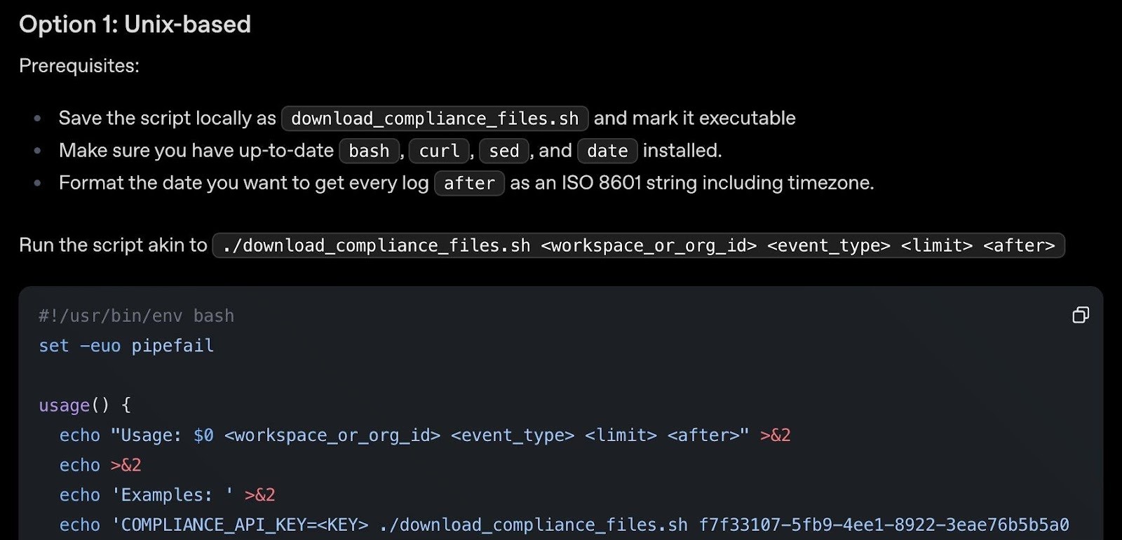 OpenAI’s download_compliance_files.sh script for Unix. Handles listing, paging, and downloading compliance log files for given event types and time ranges. Requires bash, curl, sed, and date.