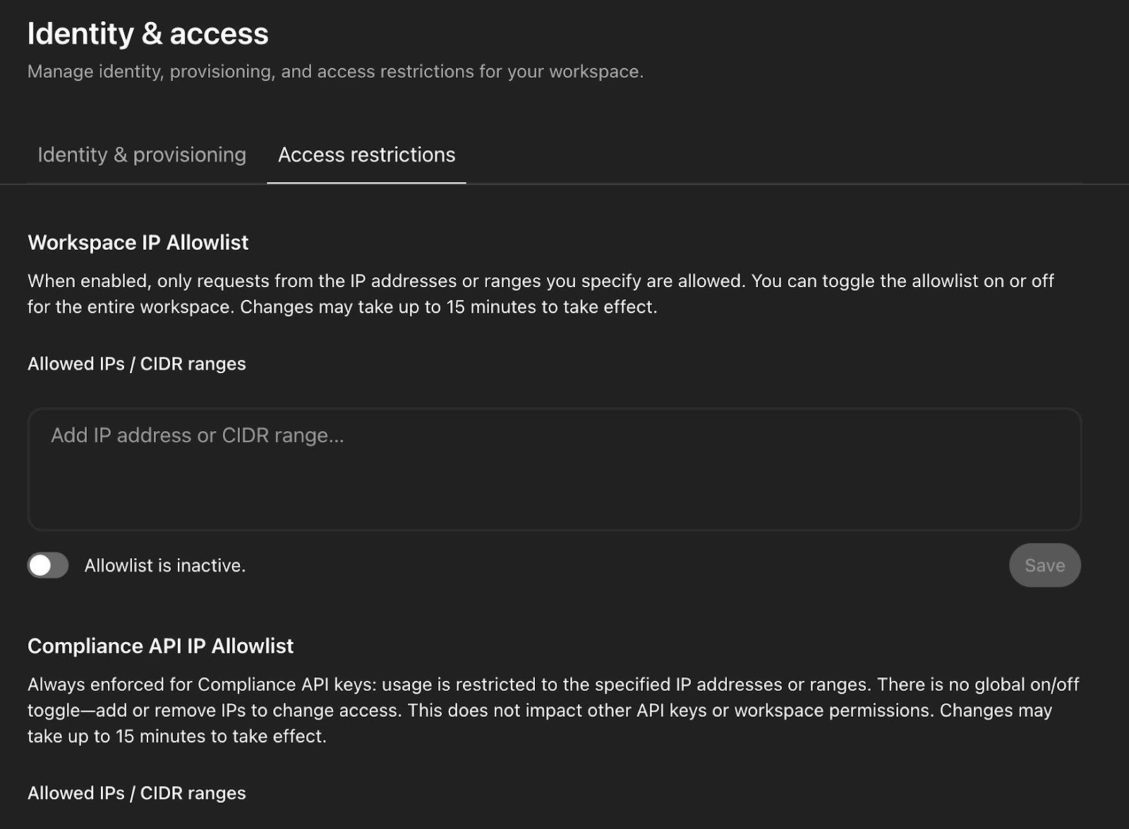 While you’re in the Identity & Access settings, also check the Access Restrictions tab. ChatGPT Enterprise supports workspace-level IP allowlisting as well as a separate Compliance API IP allowlist. The workspace allowlist is inactive by default—consider enabling it if your organization restricts access to corporate networks or VPNs.