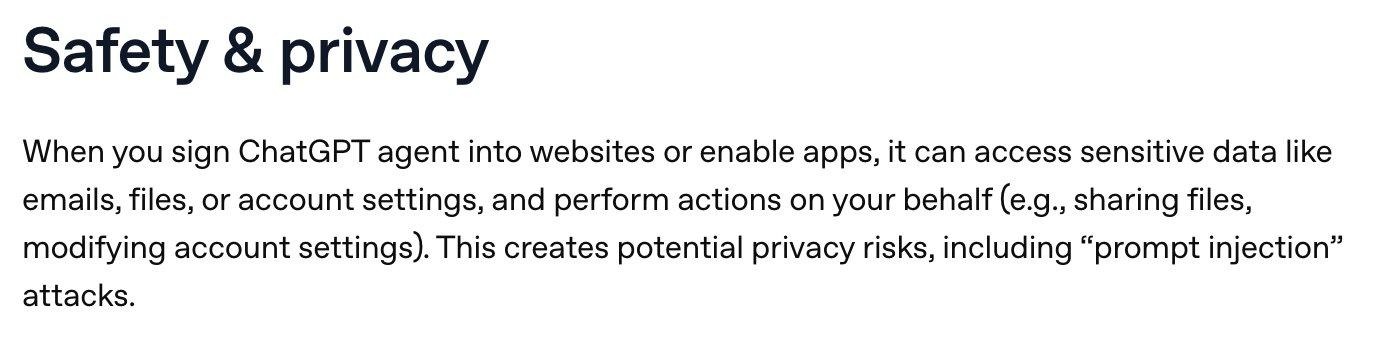 OpenAI’s own Safety & privacy documentation for Agent mode. “When you sign ChatGPT agent into websites or enable apps, it can access sensitive data like emails, files, or account settings, and perform actions on your behalf. This creates potential privacy risks, including prompt injection attacks.”