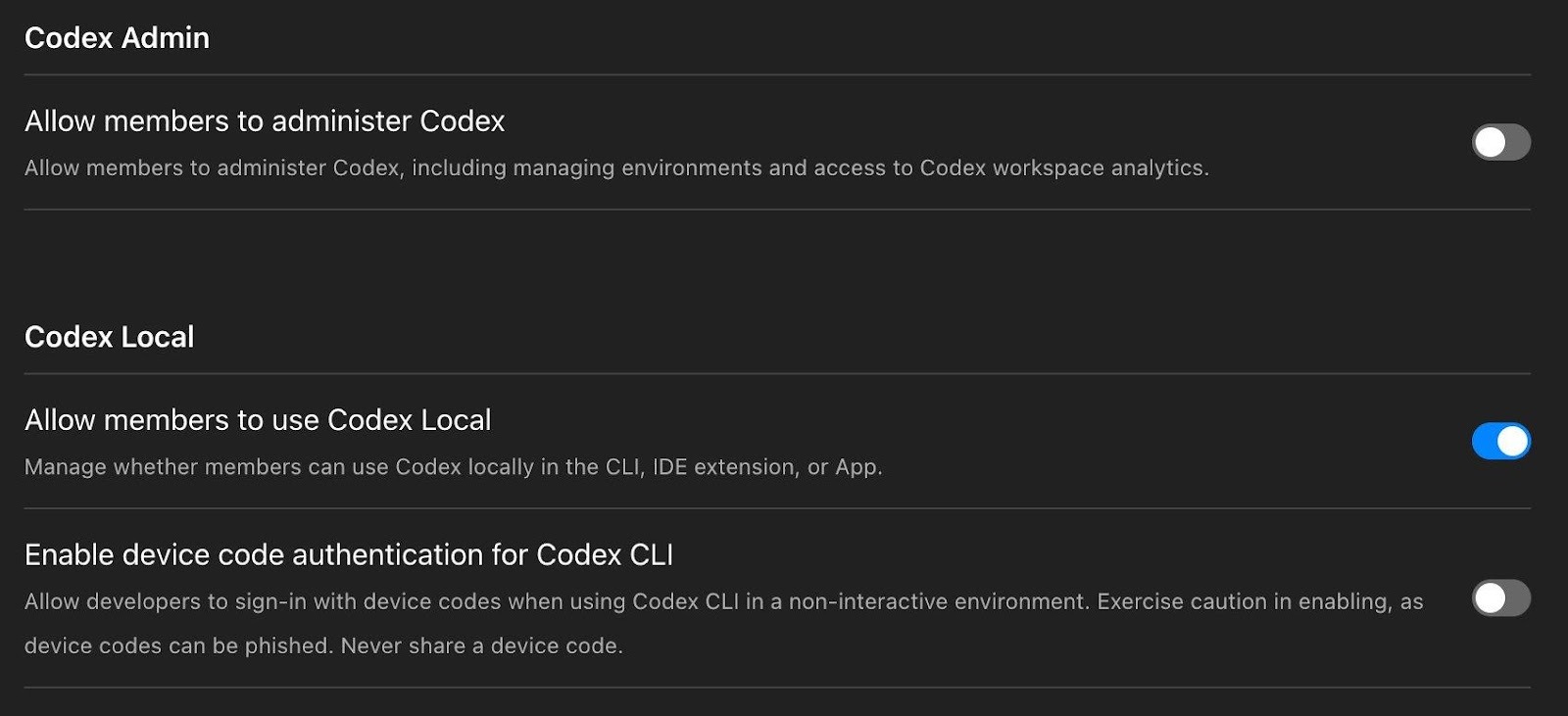 Codex Admin and Codex Local workspace settings. Member administration is off by default. Codex Local (CLI, IDE extension, App) is enabled—review whether all developers need local access. The device code authentication toggle is off by default with an explicit phishing warning: “Exercise caution in enabling, as device codes can be phished.” (Codex Enterprise Admin Setup)