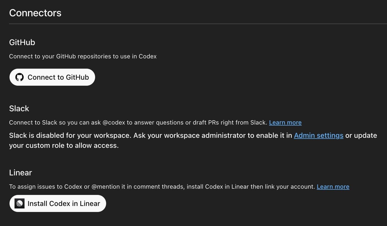 Codex Connectors page showing GitHub, Slack, and Linear integrations. Slack is disabled by default and requires workspace admin enablement. GitHub must be connected for Codex Cloud to function. Each connector expands Codex’s reach so only enable what your team needs.