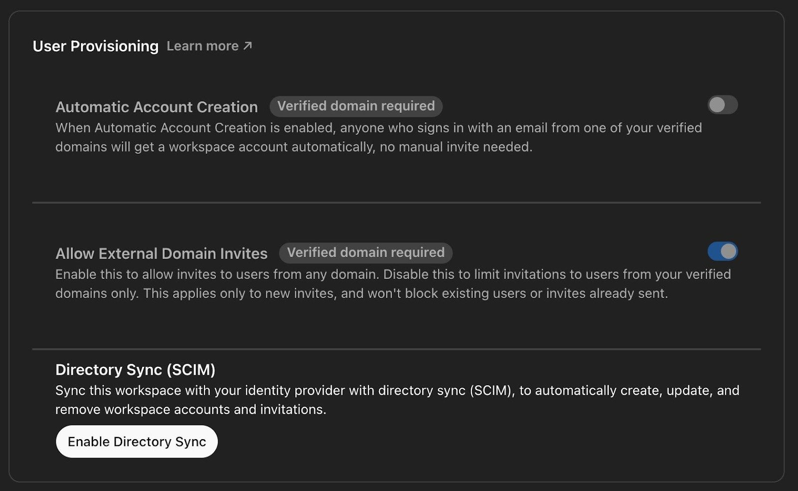 The User Provisioning panel under Identity & Access. Automatic Account Creation (requires verified domain) auto-enrolls users signing in with your domain email. Allow External Domain Invites controls whether non-domain users can be invited. Directory Sync (SCIM) connects to your IdP for automatic account creation, updates, and removal.