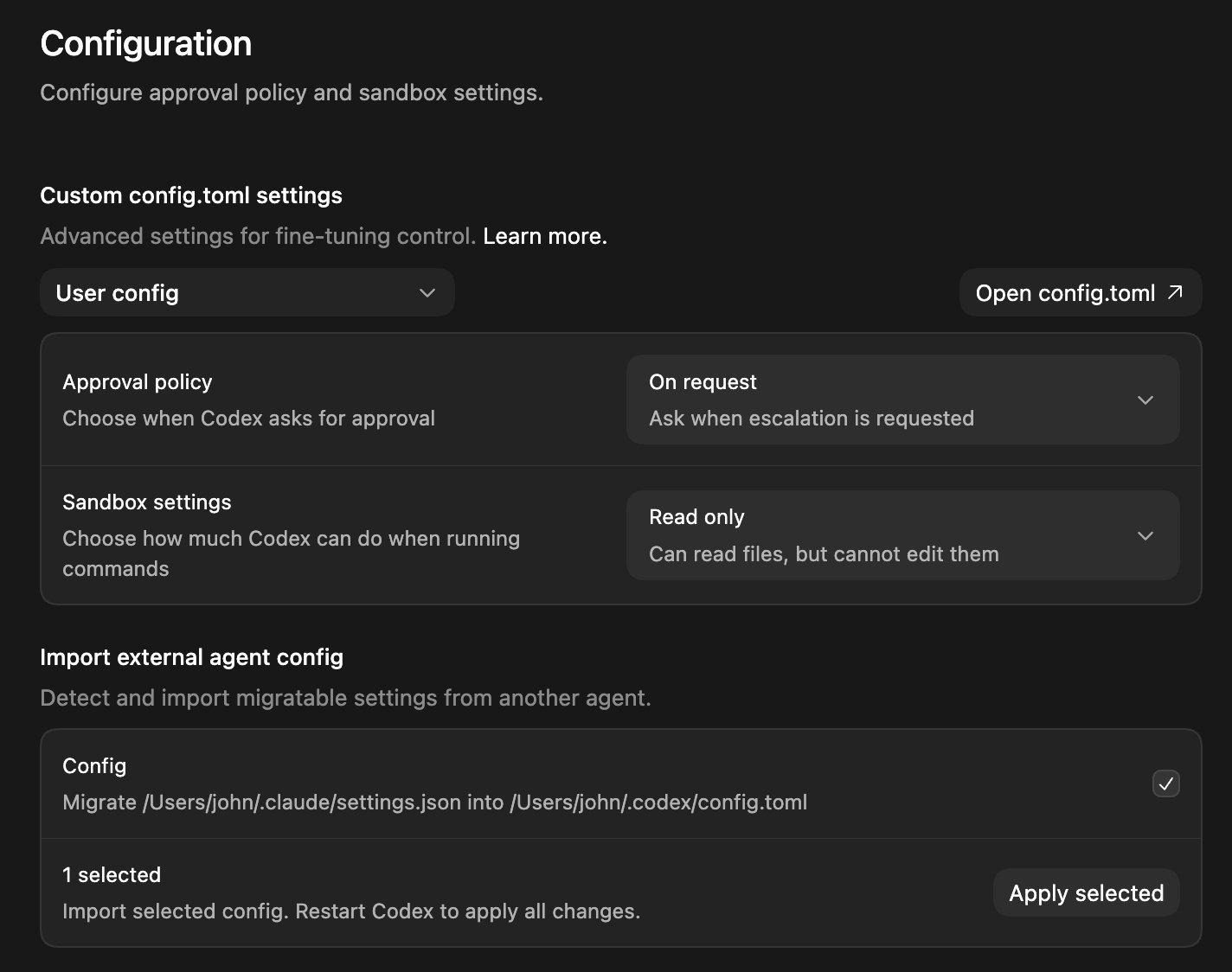 The Codex app Configuration panel. Approval policy is set to “On request” (ask when escalation is needed) and Sandbox settings are set to “Read only” (can read files but cannot edit them). Note the Import external agent config section at the bottom—Codex can migrate settings from Claude Code (/Users/john/.claude/settings.json → /Users/john/.codex/config.toml). (Codex Security docs)