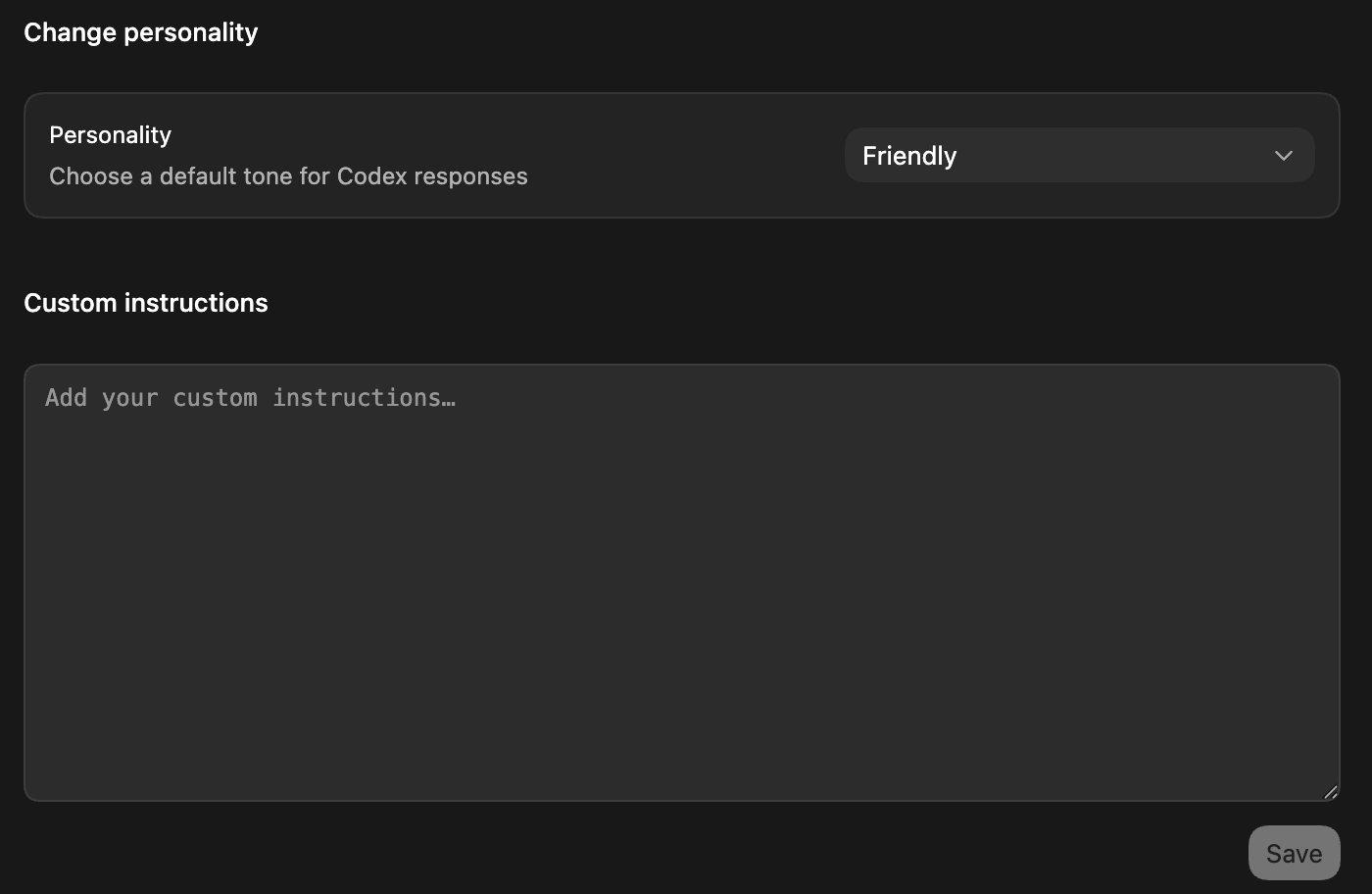 Codex Personality and Custom Instructions. You can set a default tone and add custom instructions that apply to all Codex interactions. Use this for org-wide guardrails like “never commit directly to main” or “always run tests before creating a PR.”