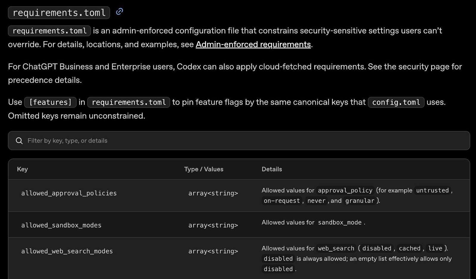 The requirements.toml reference. Key enforceable settings: allowed_approval_policies (restrict to untrusted, on-request, never, or granular), allowed_sandbox_modes, and allowed_web_search_modes (disabled, cached, live). Use [features] to pin feature flags that match config.toml keys. (Managed Configuration docs)
