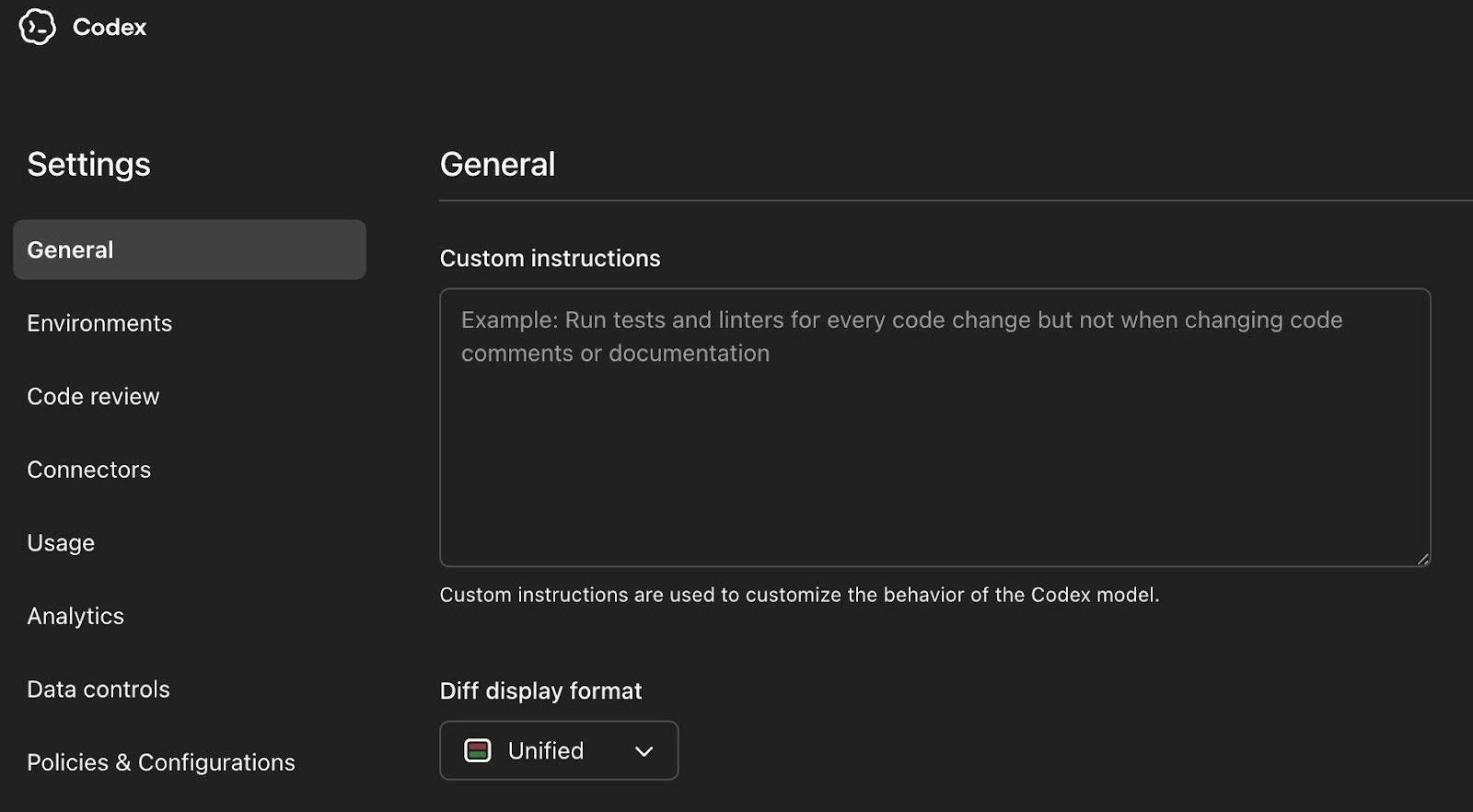 The Codex Settings page showing the full navigation: General, Environments, Code Review, Connectors, Usage, Analytics, Data Controls, and Policies & Configurations. Custom instructions here apply across all Codex surfaces.