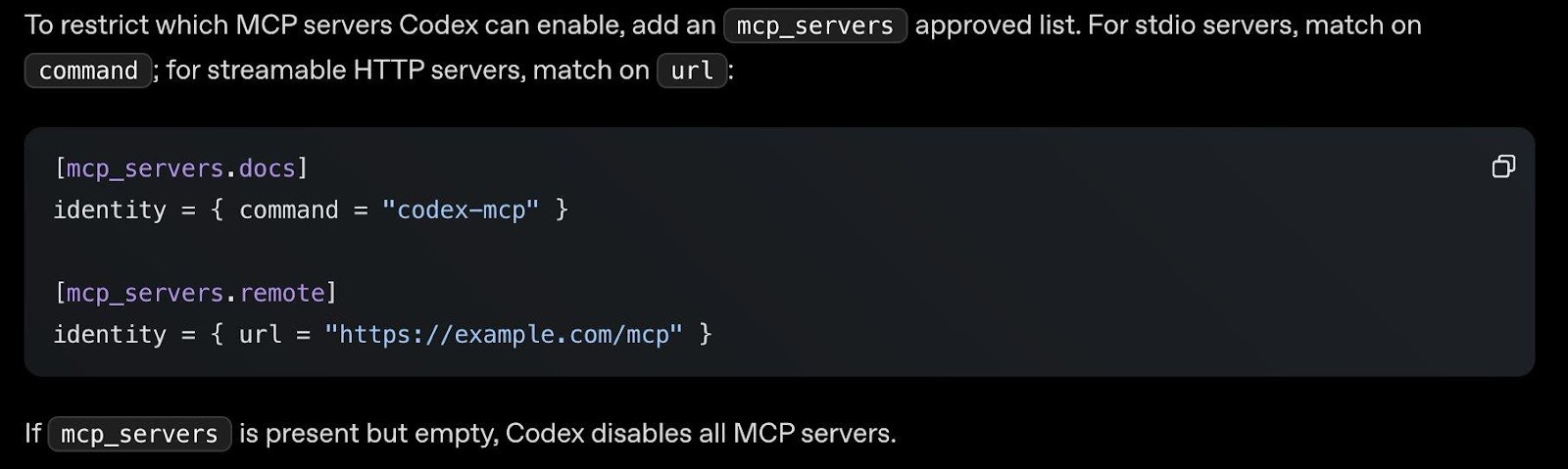 MCP server restrictions via requirements.toml. Add an mcp_servers approved list to restrict which MCP servers Codex can connect to. An empty mcp_servers section disables all MCP servers—a good default for locked-down environments.