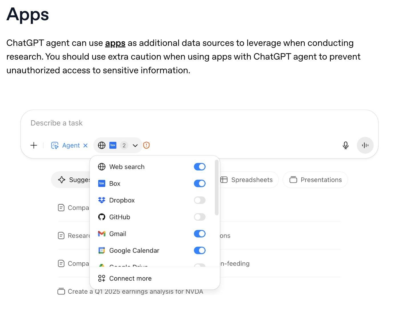 Agents don’t just browse…they can use your connected apps as data sources during research. Any app you’ve enabled (Box, Gmail, Google Calendar, GitHub, etc.) becomes available to the agent. OpenAI’s documentation warns to “use extra caution when using apps with ChatGPT agent to prevent unauthorized access to sensitive information.”