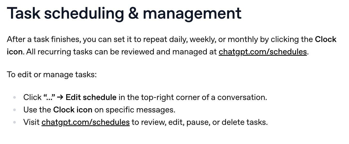 Agent Task scheduling & management. Tasks can be set to repeat daily, weekly, or monthly. All recurring tasks are managed at chatgpt.com/schedules. This is autonomous execution on a schedule—review what’s been scheduled.