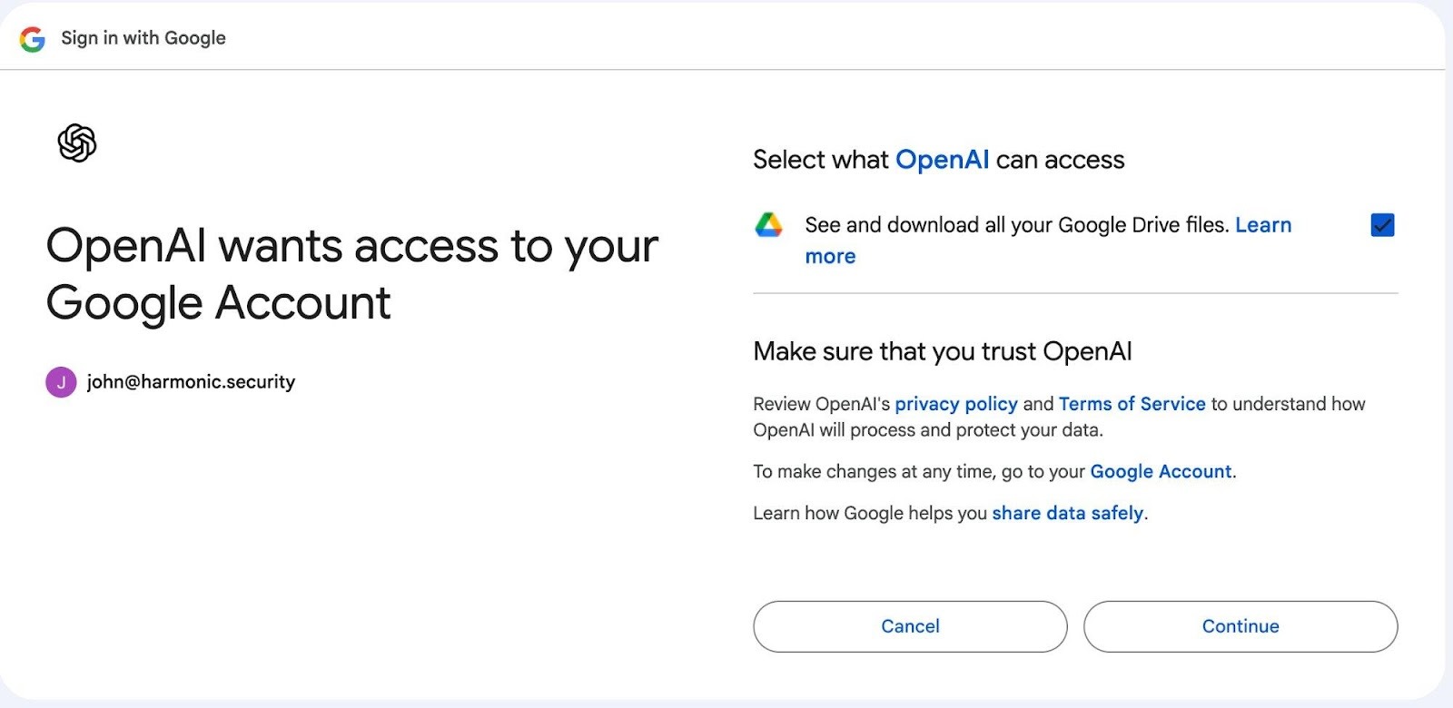 The Google OAuth consent screen showing OpenAI requesting “See and download all your Google Drive files.” Each user authenticates individually but the scope is broad. Review what you’re granting for every app.