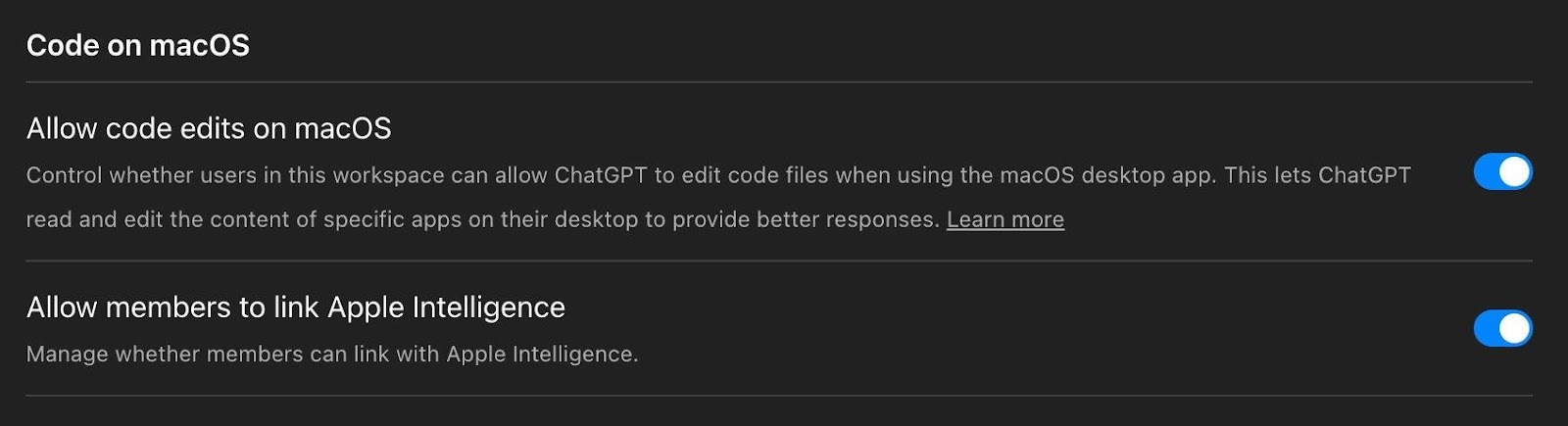 Code on macOS: “Allow code edits on macOS” lets ChatGPT read and edit code files via the desktop app which is enabled by default. Apple Intelligence linking is also enabled by default. Review whether your organization wants these capabilities active.