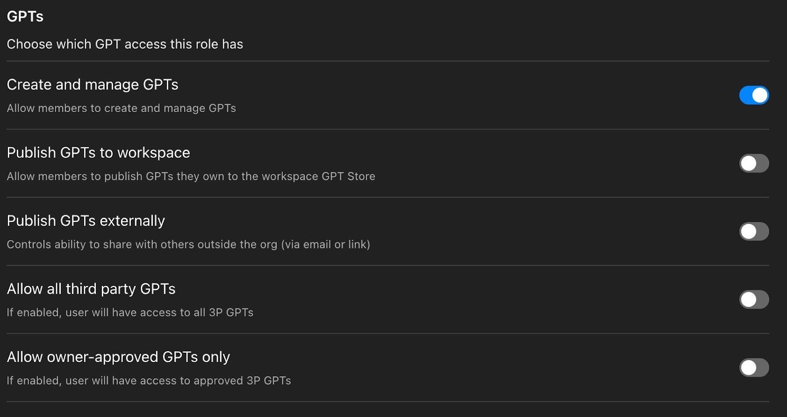 The GPTs permission panel. “Create and manage GPTs” is on by default, but Publish GPTs to workspace, Publish GPTs externally, Allow all third party GPTs, and Allow owner-approved GPTs only are all off by default. These are gGood defaults but it is important to verify they haven’t been changed.