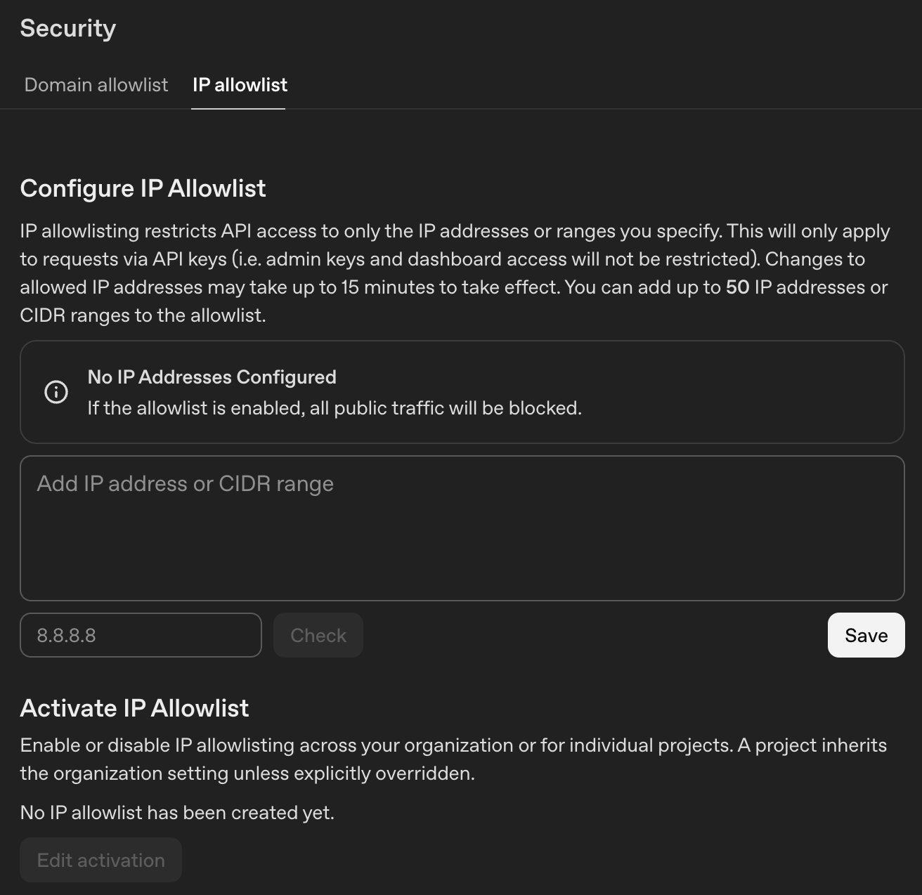 The API Platform’s IP Allowlist. Restrict API access to specific IPs or CIDR ranges (up to 50). This only applies to API key requests: admin keys and dashboard access are not restricted.