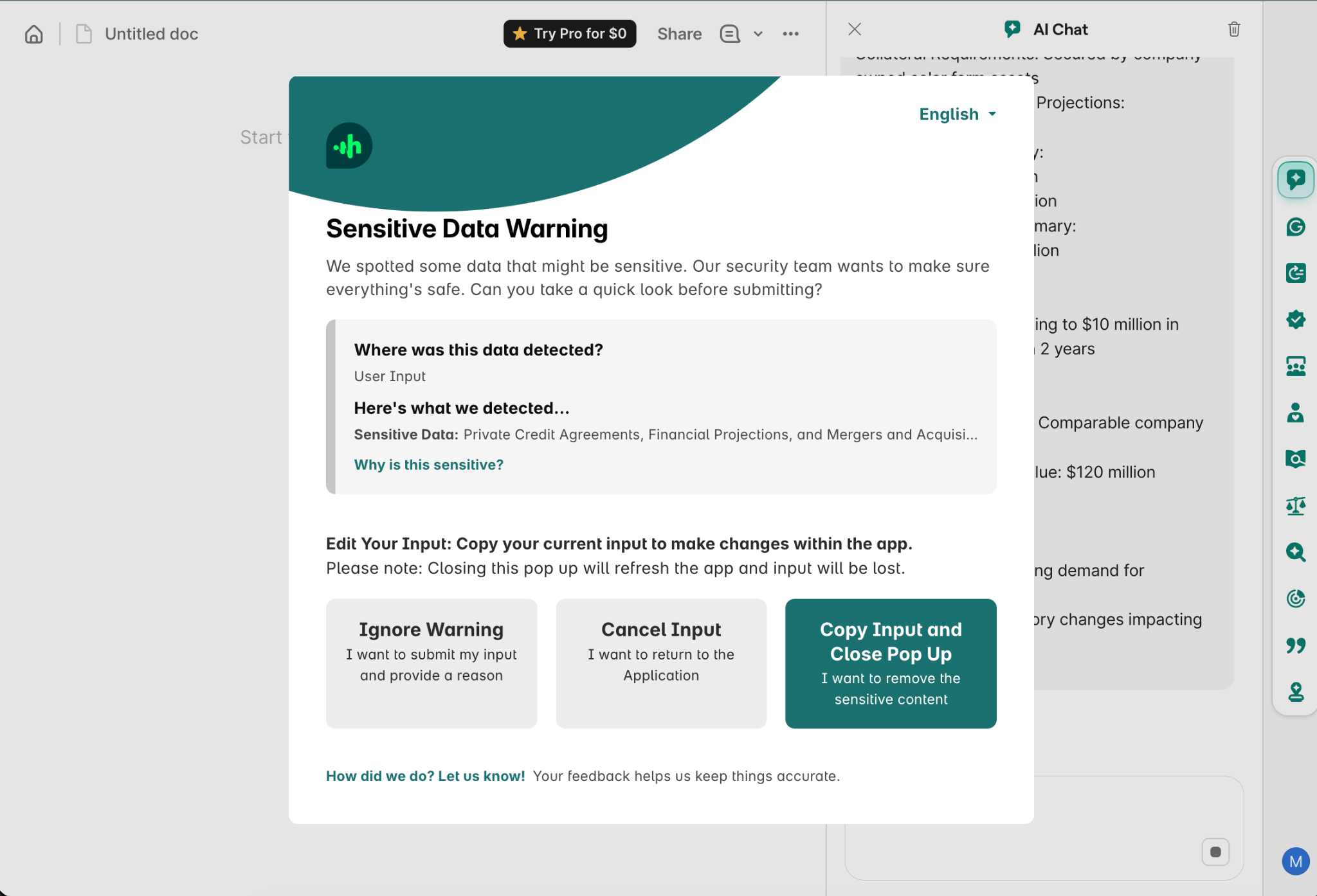 With endpoint-native controls, Harmonic analyzes content semantically as it's typed—identifying sensitive data types in real-time before transmission to AI services. This enables contextual policies: marketing can use writing assistants freely while legal and finance get automatic redaction of regulated content.