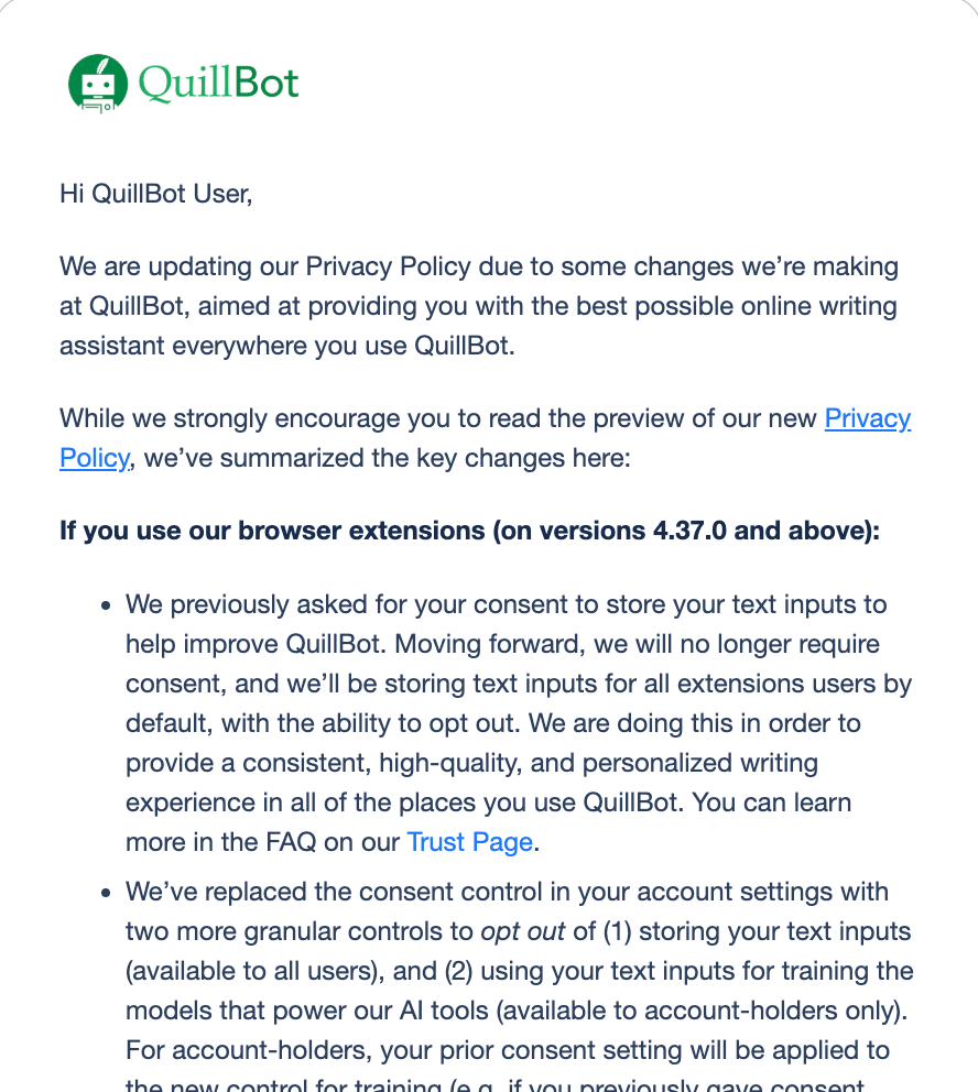 QuillBot recently updated its privacy policy with a significant change: they now store text inputs from all desktop users by default. Previously, input processing occurred solely in real-time without storage.