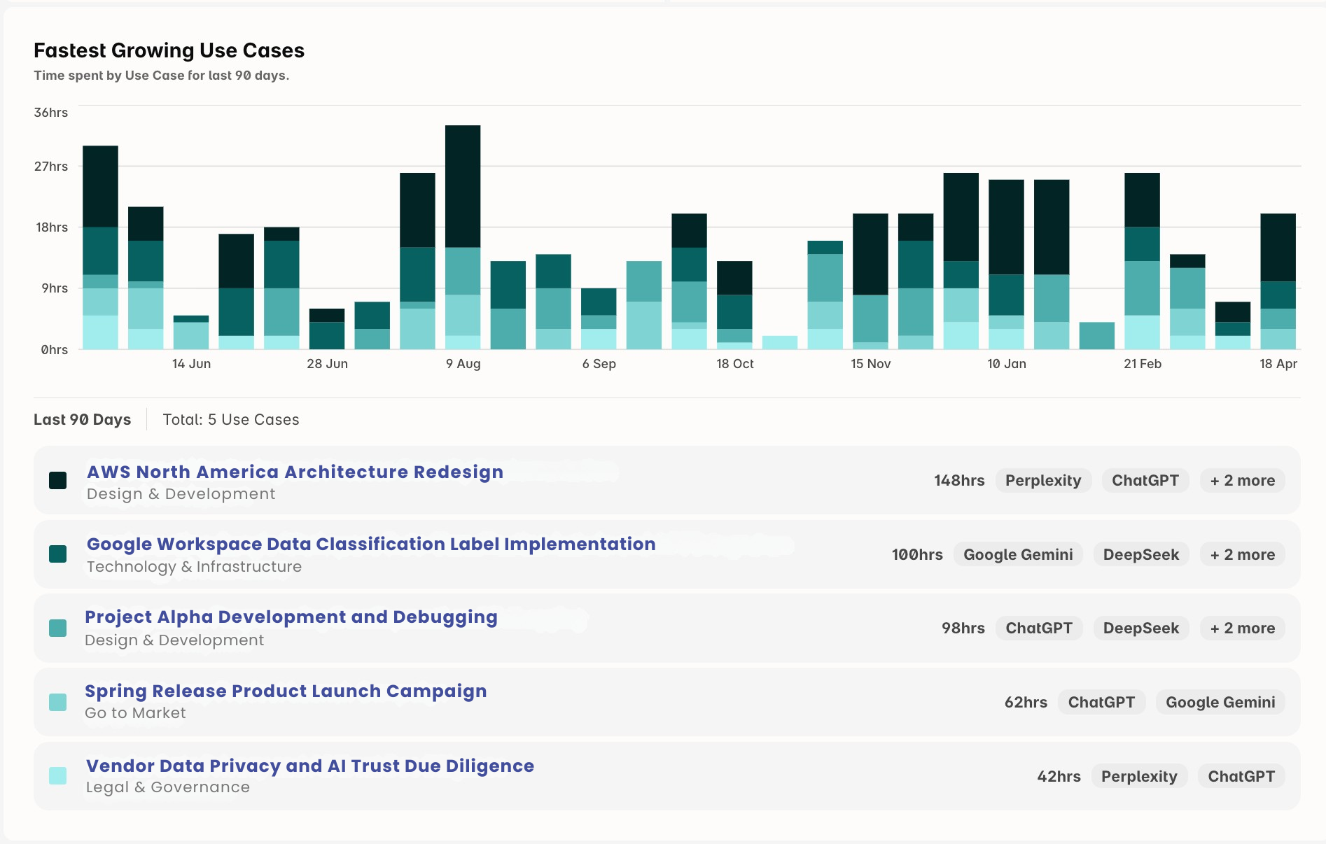 See exactly where AI is paying off. Harmonic shows you which use cases are driving real productivity, which teams are leading adoption, and how AI work is trending across the business over time.