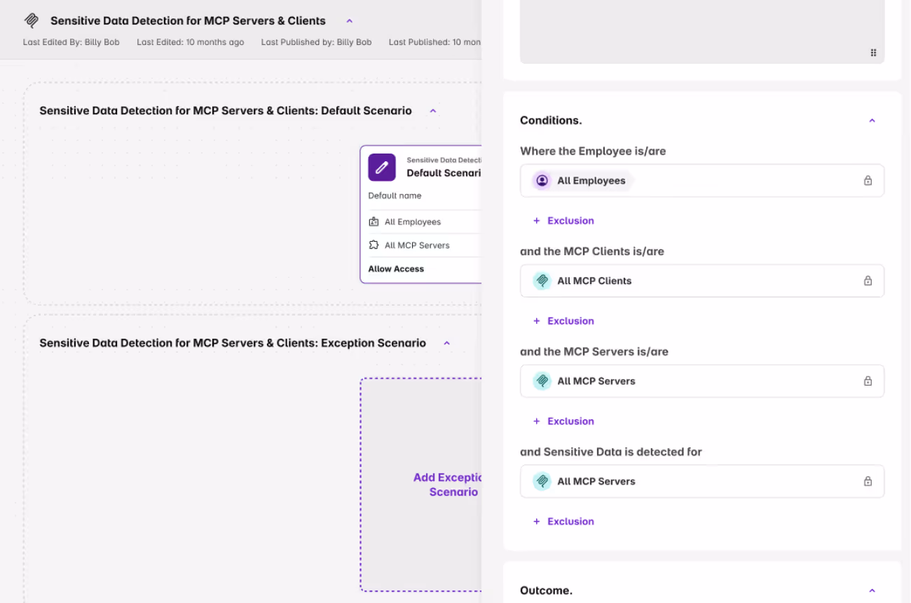 Continuously discover and inventory AI activity in the browser along with the MCP servers and clients operating in your environment. This provides a real-time view of the tools employees are using and the autonomous workflows running behind the scenes.